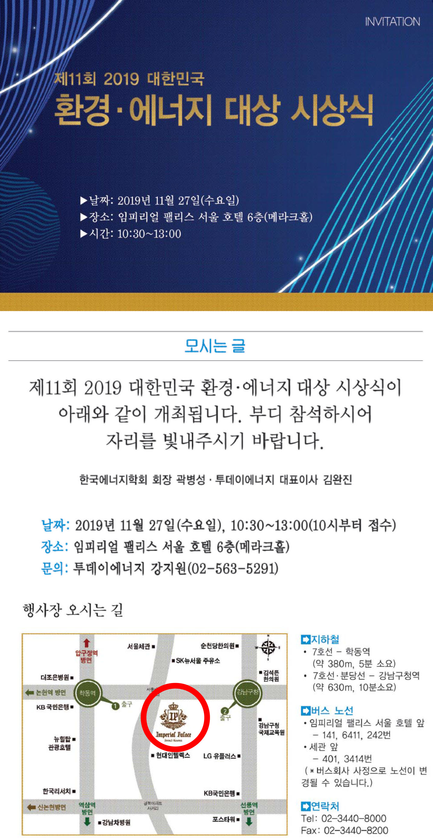 2019 대한민국 환경에너지대상 시상식이 위와 같이 개최됩니다.