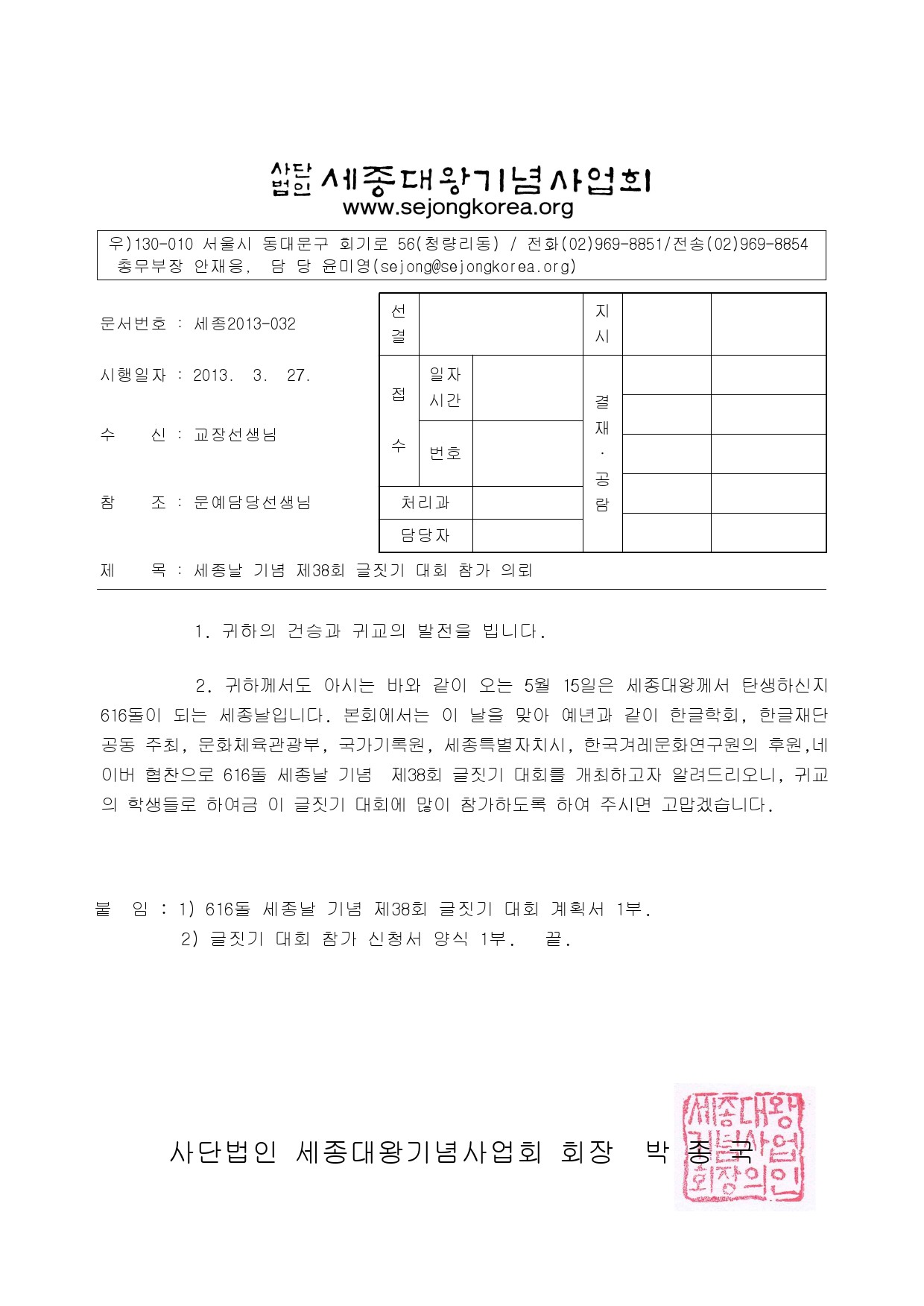 링크1: http://www.sejongkorea.org/bbs/tb.php/notice/87/e81f9838e235e4234b9e94cc324226d9 제38회 전국 초/중/고 글짓기대회를 개최하오니 많은 참여부탁드립니다.