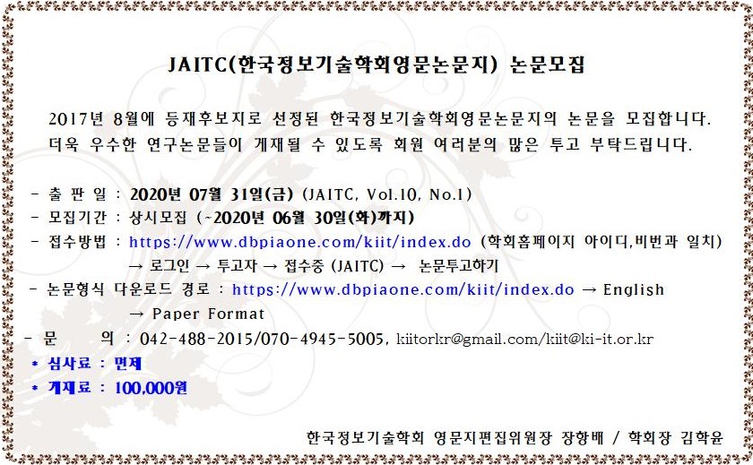 * 논문 접수 및 논문형식 다운로드 사이트 : https://www.dbpiaone.com/kiit/index.do (학회 홈페이지의 아이디와 비밀번호 일치)